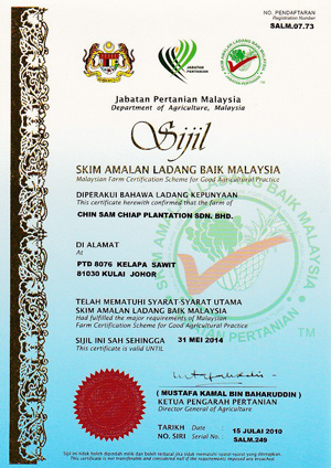 • Chin Sam Chiap Plantation Sdn Bhd achieved with a Skim Alaman Ladang Baik Malaysia (SALM) 2009 & 2010 by Jabatan Pertanian Malaysia. |