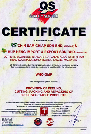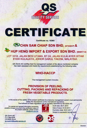 • Chin Sam Chiap Sdn Bhd & Hup heng Import & Export Sdn Bhd is recognized by QS Quality Service, with a WHO HACCP & WHO-GMP Certificate.