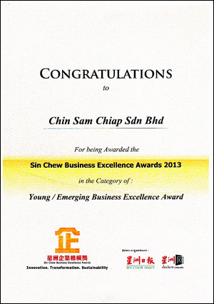 • Chin Sam Chiap Sdn Bhd achieved with a Sin Chew Business Award 2013 ( Young & Emerging Excellence Award) by Sin Chew Daily. |